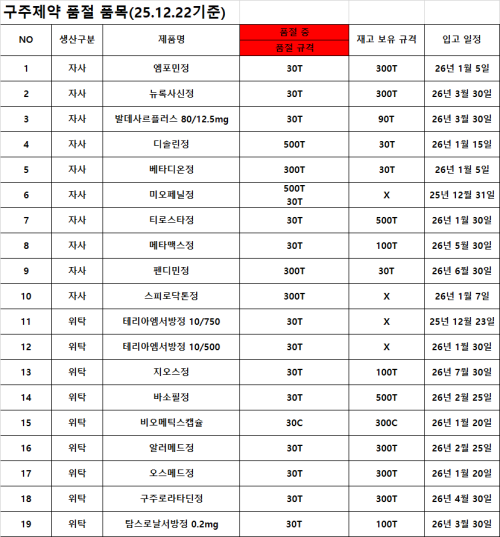 품절미송 12월 22일ㅣ품절 및 입고 일정 안내 작성자관리자 등록일 25-12-23 조회46회 업로드 일시 2025-12-23 품절 & 입고 구주제약/국제약품/삼성제약/씨엠지제약/안국뉴팜/알리코제약/킵스바이오/테라젠이텍스/팜젠사이언스 본문 12월 23일ㅣ품절 및 입고 일정 안내 12월 19일ㅣ품절 및 입고 일정 안내 목록