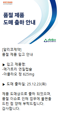 품절미송 12월 24일ㅣ품절 및 입고 일정 안내 작성자관리자 등록일 25-12-24 조회41회 업로드 일시 2025-12-24 품절 & 입고 알리코제약, 킵스바이오파마 품절 해제 이든파마 본문 12월 26일ㅣ품절 및 입고 일정 안내 12월 23일ㅣ품절 및 입고 일정 안내 목록