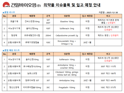 품절미송 12월 30일ㅣ품절 및 입고 일정 안내 작성자관리자 등록일 25-12-30 조회40회 업로드 일시 2025-12-30 품절 & 입고 건일바이오팜,구주제약,국제약품,에이치엘비,한국휴텍스 본문 01월 02일ㅣ품절 및 입고 일정 안내 12월 29일ㅣ품절 및 입고 일정 안내 목록