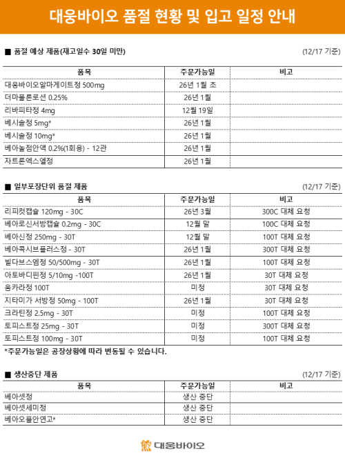 품절미송 12월 17일ㅣ품절 및 입고 일정 안내 작성자관리자 등록일 25-12-18 조회47회 업로드 일시 2025-12-17 품절 & 입고 대웅바이오 품절 해제 이든파마 본문 12월 16일ㅣ품절 및 입고 일정 안내 12월 15일ㅣ품절 및 입고 일정 안내 목록