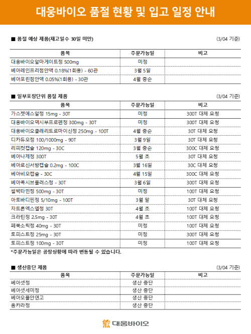 품절미송 03월 04일ㅣ품절 및 입고 일정 안내 작성자관리자 등록일 26-03-04 조회3회 업로드일시 26.03.04 품절 및 입고 대웅바이오,삼성제약,안국약품 본문 03월 03일ㅣ품절 및 입고 일정 안내 목록