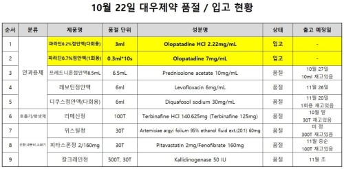 품절미송 ※ 품절 및 입고 일정 안내 작성자관리자 등록일 25-10-22 조회88회 업로드 날짜 2025-10-22 품절 & 입고 대우제약, 이든파마, 동국제약 품절 해제 동구바이오 본문 10월 24일ㅣ품절 및 입고 일정 안내 ※ 품절 및 입고 일정 안내 목록