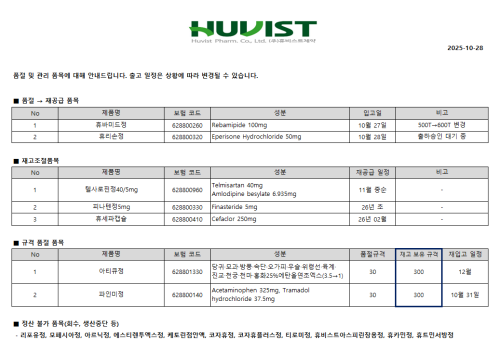 품절미송 10월 28일ㅣ품절 및 입고 일정 안내 작성자관리자 등록일 25-10-28 조회87회 업로드 일시 2025-10-28 품절 & 입고 휴비스트제약, 진양제약, 건일바이오팜 본문 10월 29일ㅣ품절 및 입고 일정 안내 10월 27일ㅣ품절 및 입고 일정 안내 목록