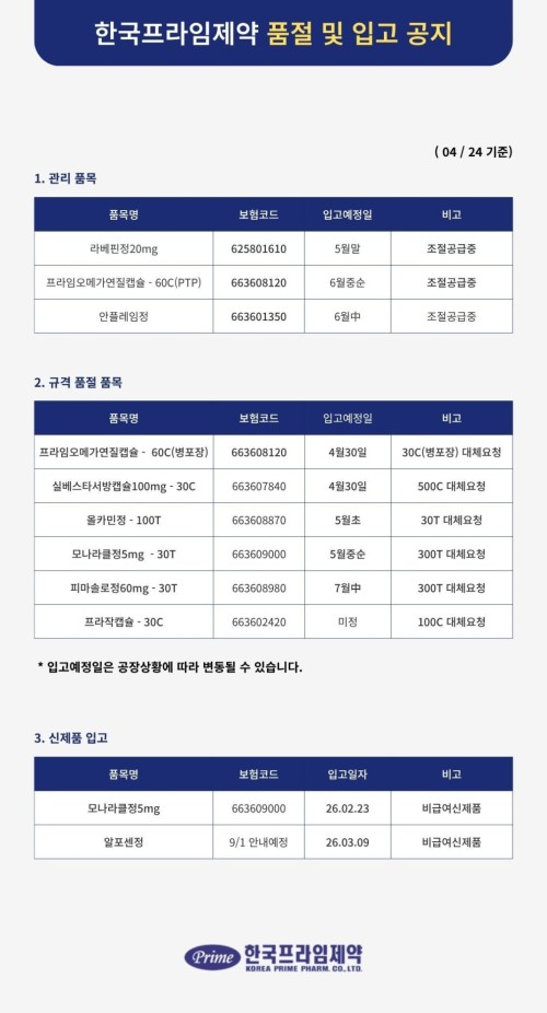품절미송 04월 24일ㅣ품절 및 입고 일정 안내 작성자관리자 등록일 26-04-24 조회25회 업로드 일시 26.04.24 품절 및 입고 프라임제약, 위더스제약,대한뉴팜, 서울제약, 국제약품 본문 04월 23일ㅣ품절 및 입고 일정 안내 목록