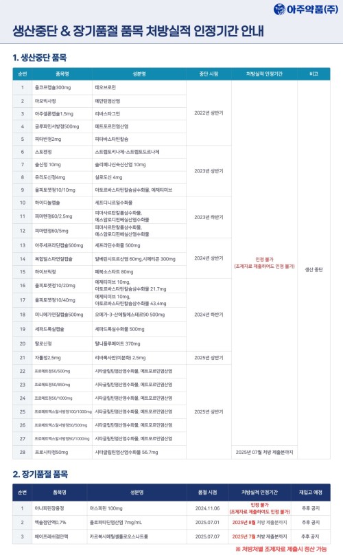 품절미송 아주약품ㅣ품목별 실적 인정기간 작성자관리자 등록일 25-09-29 조회96회 업로드 일시 2025-09-29 생산 중단 아예 정산 불가 장기 품절 조제자료 필요 본문 ※ 품절 및 입고 일정 안내 ※ 품절 및 입고 일정 안내 목록