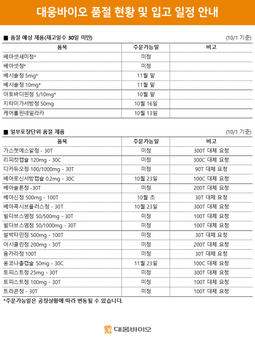 품절미송 ※ 품절 및 입고 일정 안내 작성자관리자 등록일 25-10-01 조회87회 업로드 날짜 2025-10-01 품절 & 입고 대웅바이오 본문 ※ 품절 및 입고 일정 안내 ※ 품절 및 입고 일정 안내 목록