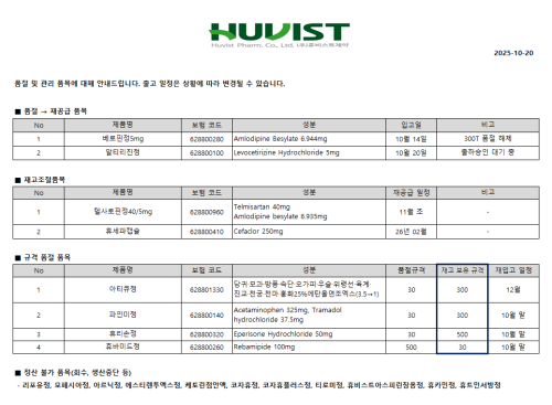 품절미송 ※ 품절 및 입고 일정 안내 작성자관리자 등록일 25-10-20 조회91회 업로드 날짜 2025-10-20 품절 & 입고 휴비스트제약, 대한뉴팜, 구주제약, 마더스제약, 비보존제약, 유유제약, 알리코제약, 삼성제약, 팜젠사이언스, 옵투스제약 본문 ※ 품절 및 입고 일정 안내 ※ 품절 및 입고 일정 안내 목록
