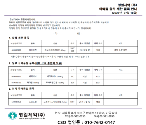 품절/미송 ※ 품절 및 입고 일정 안내 작성자관리자 등록일 25-07-10 조회103회 업로드 날짜 2025-07-10 품절ㆍ입고 일정 영일제약, 대한뉴팜, 비보존제약, 대웅바이오, 삼성제약 품절해소 알리코제약, 건일바이오팜 본문 ※ 품절 및 입고 일정 안내 ※ 품절 및 입고 일정 안내 목록
