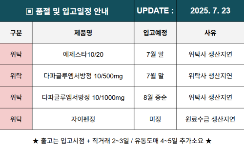 품절/미송 ※ 품절 및 입고 일정 안내 작성자관리자 등록일 25-07-23 조회117회 업로드 날짜 2025-07-23 품절 & 입고 일화제약, 명문제약, 셀트리온제약, 알리코제약, 코오롱제약, 대웅바이오, 유니메드제약 본문 ※ 품절 및 입고 일정 안내 ※ 품절 및 입고 일정 안내 목록