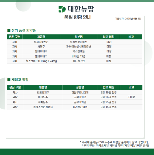 품절미송 ※ 품절 및 입고 일정 안내 작성자관리자 등록일 25-09-08 조회109회 업로드 날짜 2025-09-08 품절 & 입고 대한뉴팜, 휴비스트제약, 메디카코리아, 대우제약, 제일약품, 구주제약, 씨엠지제약, 유유제약 품절 해소 위더스제약 본문 ※ 품절 및 입고 일정 안내 ※ 품절 및 입고 일정 안내 목록