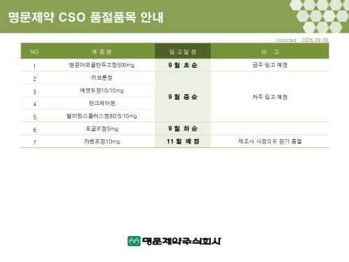 품절미송 ※ 품절 및 입고 일정 안내 작성자관리자 등록일 25-09-10 조회104회 업로드 날짜 2025-09-10 품절 & 입고 명문제약, 이든파마, 대웅바이오 품절 해소 안국뉴팜, 유니메드제약 본문 ※ 품절 및 입고 일정 안내 ※ 품절 및 입고 일정 안내 목록