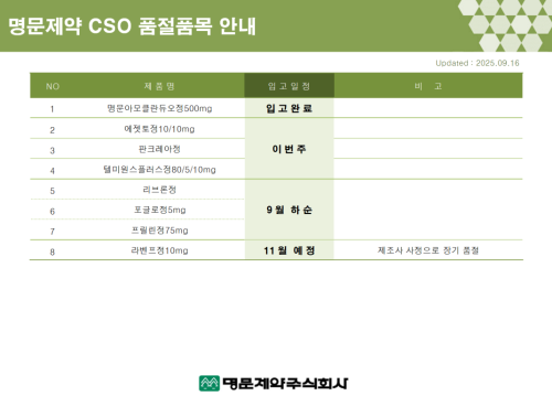 품절미송 ※ 품절 및 입고 일정 안내 작성자관리자 등록일 25-09-16 조회98회 업로드 날짜 2025-09-16 품절 & 입고 명문제약, 씨엠지제약, 파비스제약, 팜젠사이언스, 알리코제약, 테라젠이텍스 본문 ※ 품절 및 입고 일정 안내 ※ 품절 및 입고 일정 안내 목록