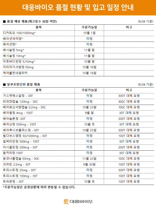 품절미송 ※ 품절 및 입고 일정 안내 작성자관리자 등록일 25-09-24 조회82회 업로드 날짜 2025-09-24 품절 & 입고 대웅바이오, 이든파마, 테라젠이텍 본문 ※ 품절 및 입고 일정 안내 ※ 품절 및 입고 일정 안내 목록