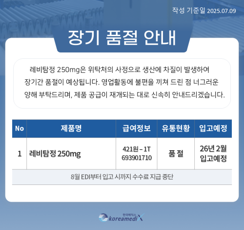 품절/미송 ※ 품절 및 입고 일정 안내 작성자관리자 등록일 25-07-09 조회119회 업로드 날짜 2025-07-09 품절ㆍ입고 일정 서울제약, 셀트리온제약 본문 ※ 품절 및 입고 일정 안내 ※ 품절 및 입고 일정 안내 목록