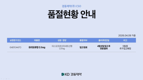품절미송 04월 09일ㅣ품절 및 입고 일정 안내 작성자관리자 등록일 26-04-09 조회21회 업로드일시 2026-04-09 풀절 및 입고 경동제약,명문제약,건일바이오팜 본문 04월 10일ㅣ품절 및 입고 일정 안내 04월 08일ㅣ품절 및 입고 일정 안내 목록