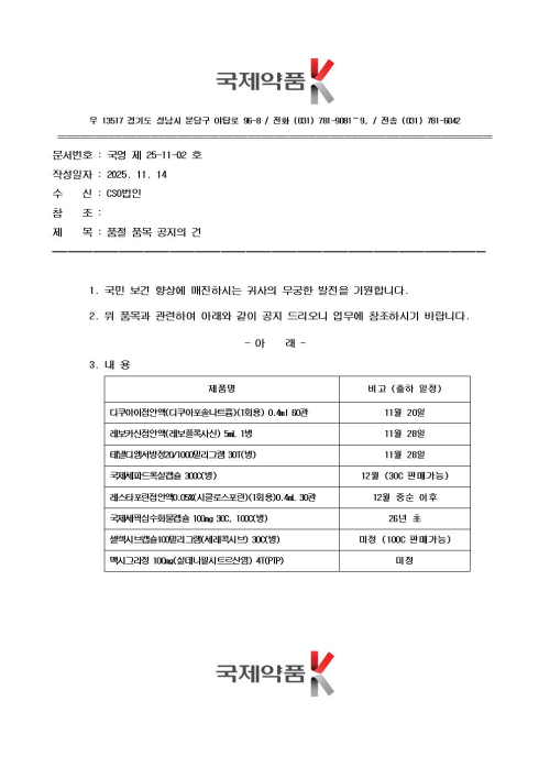 품절미송 11월 14일ㅣ품절 및 입고 일정 안내 작성자관리자 등록일 25-11-14 조회77회 업로드 일시 2025-11-14 품절 & 입고 국제약품, 동구바이오, 아주약품, 마더스제약, 에이프로젠, 제뉴원사이언스 품절 해제 위더스제약 본문 11월 17일ㅣ품절 및 입고 일정 안내 11월 13일ㅣ품절 및 입고 일정 안내 목록