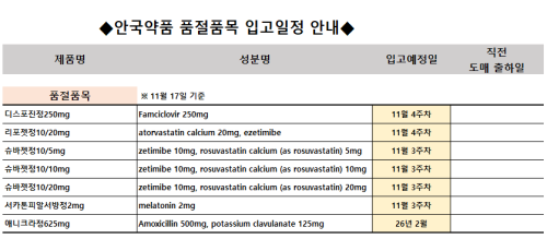 품절미송 11월 17일ㅣ품절 및 입고 일정 안내 작성자관리자 등록일 25-11-17 조회72회 업로드 일시 2025-11-17 품절 & 입고 안국약품, 영일제약, 구주제약, 유유제약, 에이프로젠, 씨엠지제약, 팜젠사이언스, 대한뉴팜 품절 해소 일화제약 본문 11월 18일ㅣ품절 및 입고 일정 안내 11월 14일ㅣ품절 및 입고 일정 안내 목록