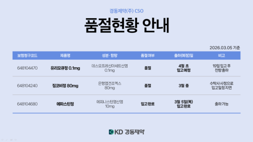 품절미송 03월 10일ㅣ품절 및 입고 일정 안내 작성자관리자 등록일 26-03-10 조회51회 업로드일시 26.03.10 품절 및 입고 경동제약,구주제약,국제약품,대한뉴팜,대화제약,동구바이오,마더스제약,킵스바이오,팜젠사이언스,한국프라임 본문 03월 13일ㅣ품절 및 입고 일정 안내 03월 04일ㅣ품절 및 입고 일정 안내 목록