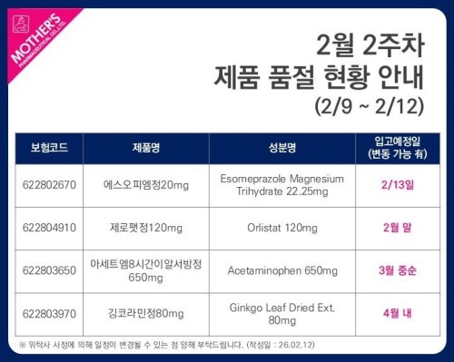 품절미송 02월 13일ㅣ품절 및 입고 일정 안내 작성자관리자 등록일 26-02-13 조회68회 업로드일시 2026-02-13 품절&입고 대한뉴팜,마더스제약,알리코제약,위더스제약,킵스바이오,한국프라임 본문 02월 19일ㅣ품절 및 입고 일정 안내 02월 11일ㅣ품절 및 입고 일정 안내 목록