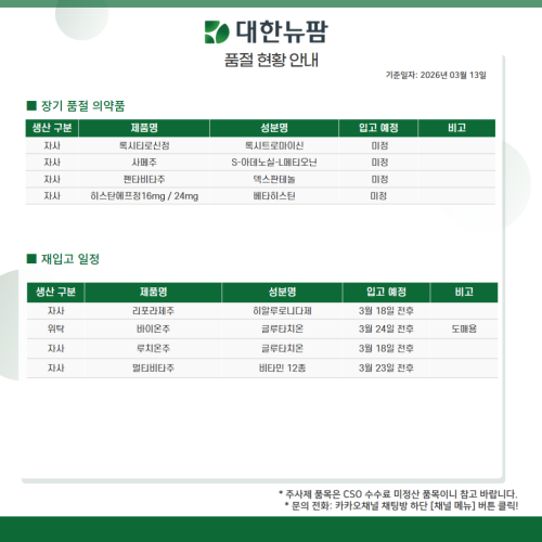 품절미송 03월 13일ㅣ품절 및 입고 일정 안내 작성자관리자 등록일 26-03-13 조회45회 업로드일시 26.03.13 품절 및 입고 건일바이오팜,국제약품,대웅바이오,대한뉴팜,마더스제약,위더스제약,한국프라임 본문 03월 18일ㅣ품절 및 입고 일정 안내 03월 10일ㅣ품절 및 입고 일정 안내 목록