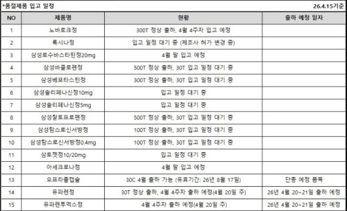 품절미송 04월 15일ㅣ품절 및 입고 일정 안내 작성자관리자 등록일 26-04-15 조회40회 업로드일시 2026-04-15 품절 및 입고 대웅바이오,라이징팜,삼성제약,한국휴텍스 본문 04월 15일ㅣ품절 및 입고 일정 안내 04월 14일ㅣ품절 및 입고 일정 안내 목록