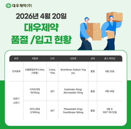 품절미송 04월 20일ㅣ품절 및 입고 일정 안내 작성자관리자 등록일 26-04-20 조회16회 업로드일시 2026-04-20 품절 및 입고 구주제약,국제약품,대우제약,마더스제약,씨엠지제약,영일제약,팜젠사이언스 본문 04월 21일ㅣ품절 및 입고 일정 안내 04월 17일ㅣ품절 및 입고 일정 안내 목록