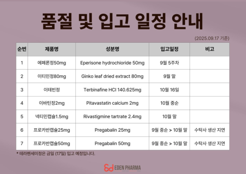 품절미송 ※ 품절 및 입고 일정 안내 작성자관리자 등록일 25-09-17 조회149회 업로드 날짜 2025-09-17 품절 & 입고 이든파마, 대웅바이오, 알리코제약 품절 해소 안국뉴팜 본문 ※ 품절 및 입고 일정 안내 ※ 품절 및 입고 일정 안내 목록
