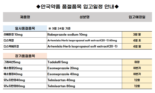 품절미송 03월 24일ㅣ품절 및 입고 일정 안내 작성자관리자 등록일 26-03-23 조회36회 업로드일시 2026-03-24 품절 및 입고 대우제약,안국약품,유니메드,유유제약,일화제약,팜젠사이언스,건일바이오팜 본문 03월 25일ㅣ품절 및 입고 일정 안내 03월 20일ㅣ품절 및 입고 일정 안내 목록