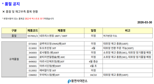 품절미송 03월 31일ㅣ품절 및 입고 일정 안내 작성자관리자 등록일 26-03-31 조회22회 업로드일시 2026-03-31 품절 및 입고 에이치엘비제약,팜젠사이언스,한국휴텍스 본문 04월 1일ㅣ품절 및 입고 일정 안내 03월 30일ㅣ품절 및 입고 일정 안내 목록