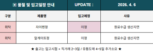 품절미송 04월 07일ㅣ품절 및 입고 일정 안내 작성자관리자 등록일 26-04-07 조회13회 업로드일시 2026-04-07 품절 및 입고 비보존제약,일화제약 본문 04월 08일ㅣ품절 및 입고 일정 안내 04월 06일ㅣ품절 및 입고 일정 안내 목록